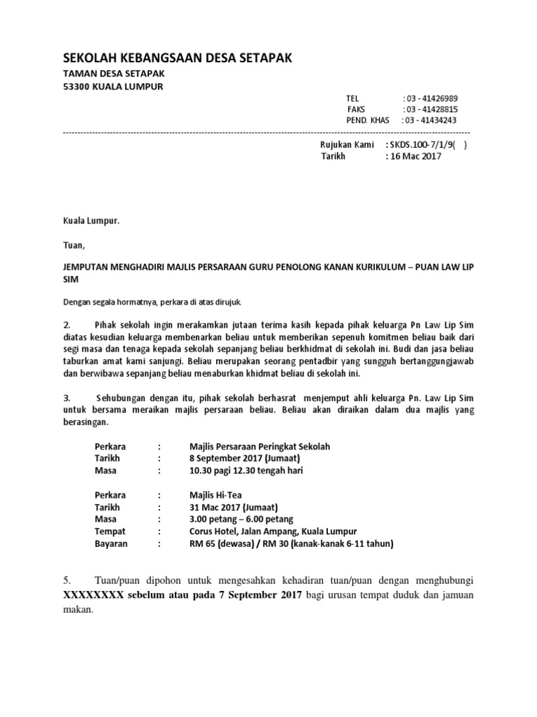 Contoh surat jemputan majlis persaraan guru besar have an image associated with the other. Format Surat Jemputan Vip Docx Kolej. Jemputan sebagai perasmi majlis perasmian penutup kejohanan sukan tahunan sekolah.